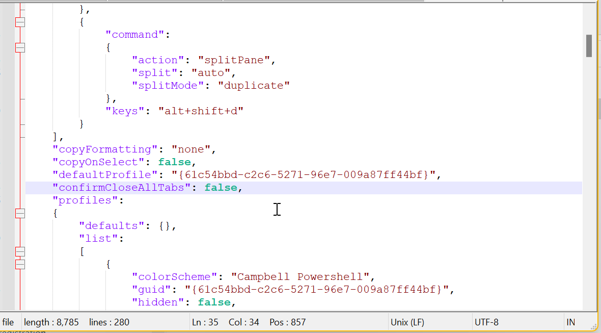 "confirmCloseAllTabs": falseI had made a couple of changes to my file so the "end" where I entered this now looks like: