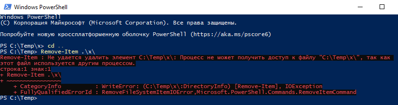 C:\temp\x, right-click that folder and select "Open PowerShell window here" and then change the directory to the parent, I can immediately delete that folder.I'm on Windows 10, 21H2. But I know that this was always working like that for previous Windows version as well.