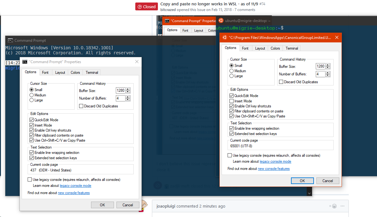 Can you paste a screenshot of both the cmd and wsl properties sheet, on the "Options" tab? It should look like this: