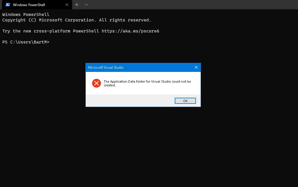 Microsoft Visual Studio -- The Application Data folder for Visual Studio could not be created. #9350